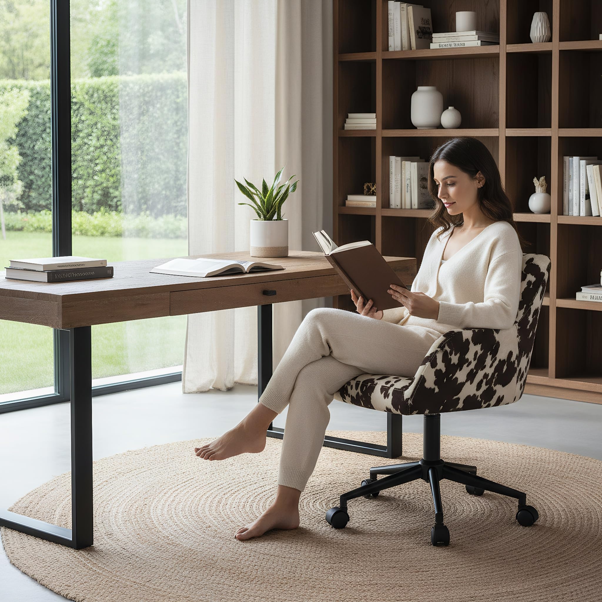 Modern Swivel Home Office Desk Chair with Wheels, Cow Print Velvet Height Adjustable Comfortable Ergonomic Upholstered Vanity Make up Chair, Cute Cowhide Computer Armchair for Living Room Home